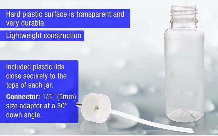 ●Jar and Lid Assembly Specifications - Material: Plastic jar bottle with plastic lid and metal adaptor connector; Connector: 1/5" (5mm) size adaptor at a 30° down angle; Fluid Capacity: 3.4 fl oz (100 cc); Bottle Height: 4.5"; Bottle Diameter: 1.5"