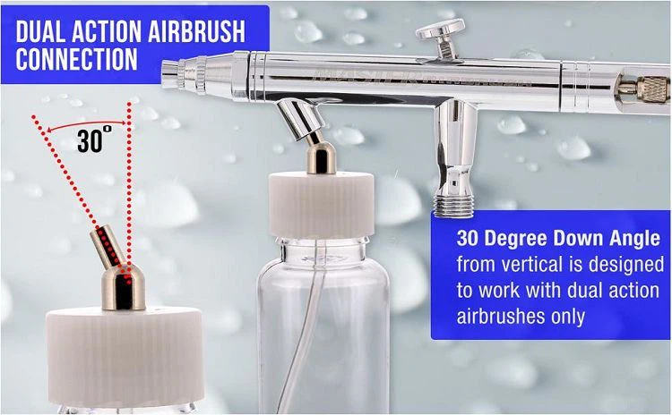 ●The connection angle is at the industry standard 30° down angle from vertical that most brands of siphon, suction, or bottom feed dual-action airbrushes use. The adaptor connection size is also at the industry standard 1/5" (5mm) size that friction-fits into the airbrushes fluid inlet.