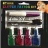 ●Includes 24 tattoo stencil designs, 6 colors of cosmetic glitters, 2 brushes for glitter application and 1 pot of body adhesive